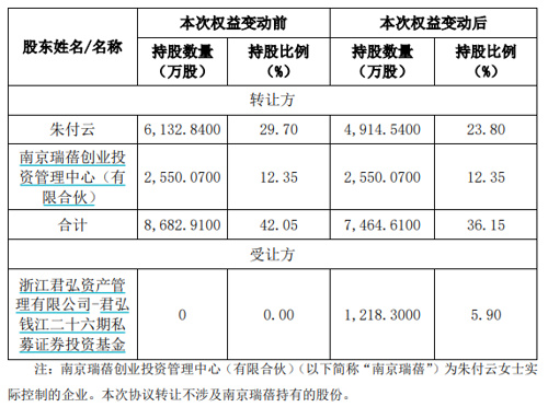亿嘉和宣布,控股股东、实际控制人朱付云拟将其持有的1218.3万股公司股份,转让给浙江君弘,占公司总股本的5.90%,转让价格为13.806元/股,转让总价为1.68亿元。