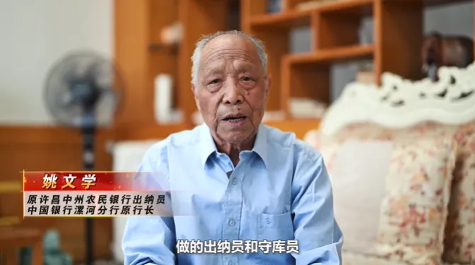 姚文学,1933年生于河南南阳,现年91岁。1949年3月至1950年5月曾任许昌中州农民银行出纳员;1950年6月至1990年2月先后在漯河人行、漯河市委市政府工作;1990年3月至1997年4月参与组建中国银行漯河市分行并担任行长、党组书记;1994年7月从中国银行漯河市分行离休。