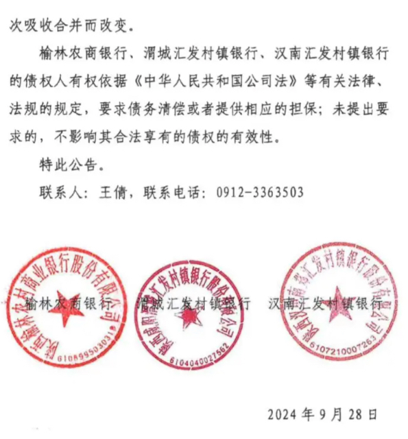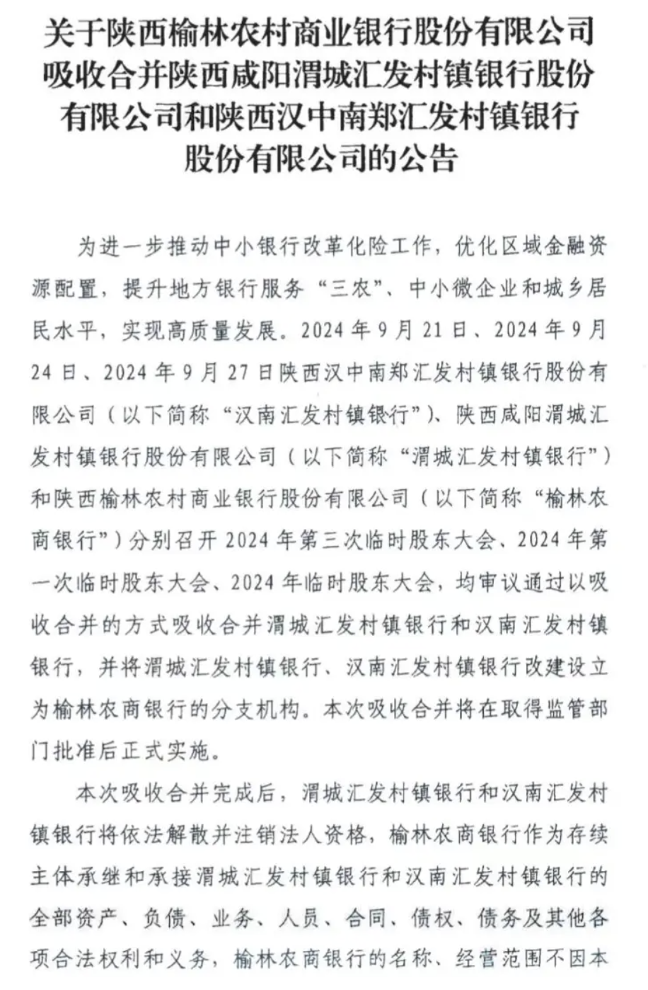 公告显示,吸收合并完成后,渭城汇发村镇银行和汉南汇发村镇银行将依法解散并注销法人资格,榆林农商银行作为存续主体承继和承接渭城汇发村镇银行和汉南汇发村镇银行的全部资产、负债、业务、人员、合同、债权、债务及其他各项合法权利和义务,榆林农商银行的名称、经营范围不因本次吸收合并而改变。