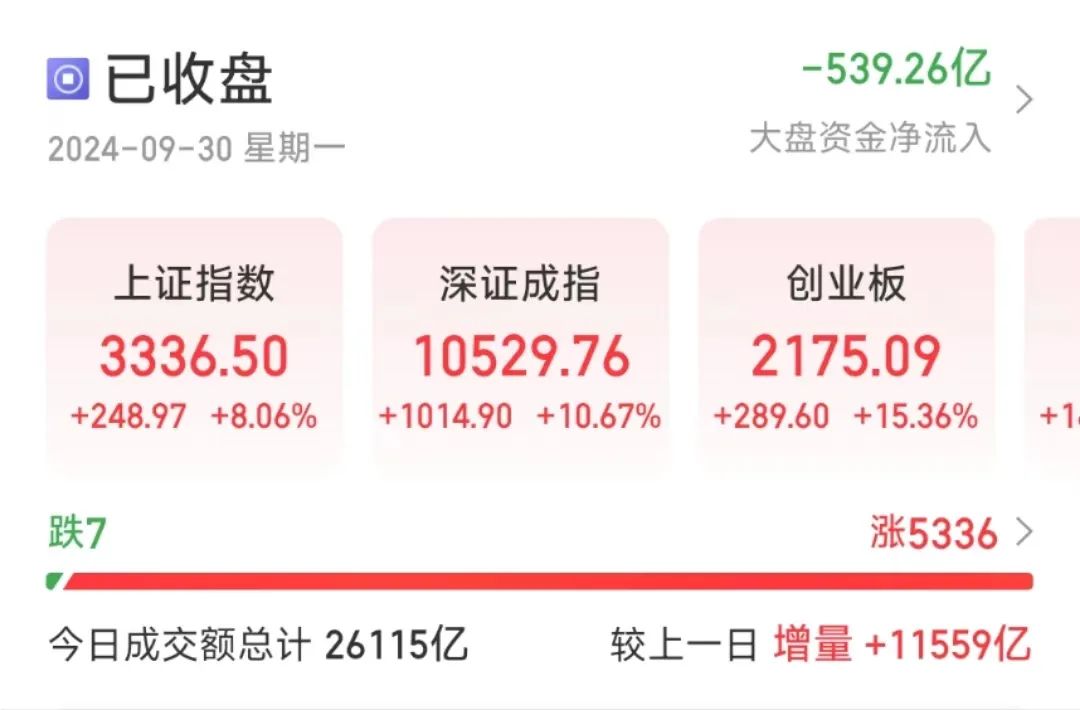 截至收盘,上证指数报3336.50点,涨8.06%;深证成指报10529.76点,涨10.67%;创业板指报2175.09点,涨15.36%。全天5336只个股上涨,仅7只股票下跌。