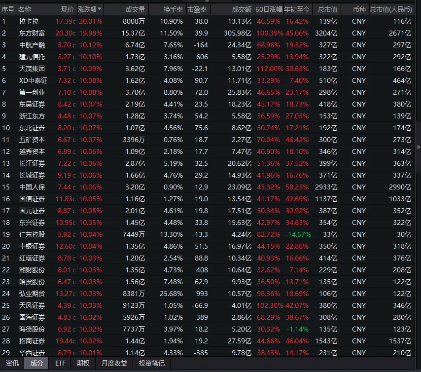券商股依旧是上涨的主力军,东方财富、拉卡拉、第一创业、东北证券、长江证券等超50只股票涨停或涨超10%。
