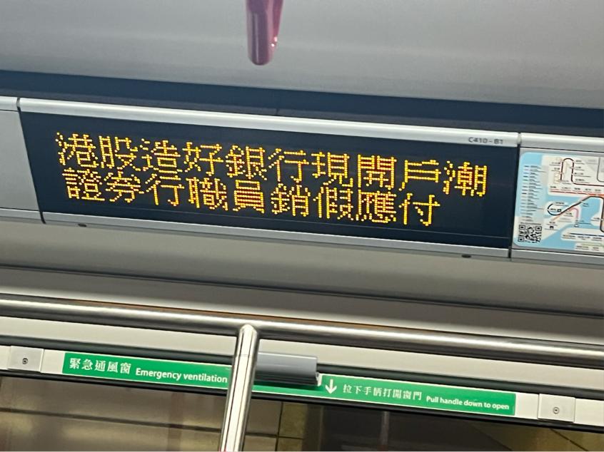 【大河财立方 见习记者 郑棋文】“港股目前形势大好,银行出现开户潮,证券行员工取消假期来应对这一情况。”国庆假期,香港地铁港岛线的列车屏幕上,正在滚动播放这一财经短讯。