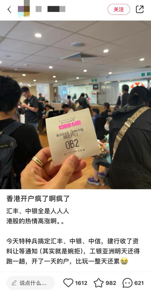值得关注的是,国庆期间暴涨的香港股市还引发了内地游客“入场”潮。更有甚者,假期去香港不为旅游,而是开户买港股。在某社交平台搜索“国庆香港开户”等话题,出现众多交流帖。有网友表示“开了一天的户,比玩一整天还累。”