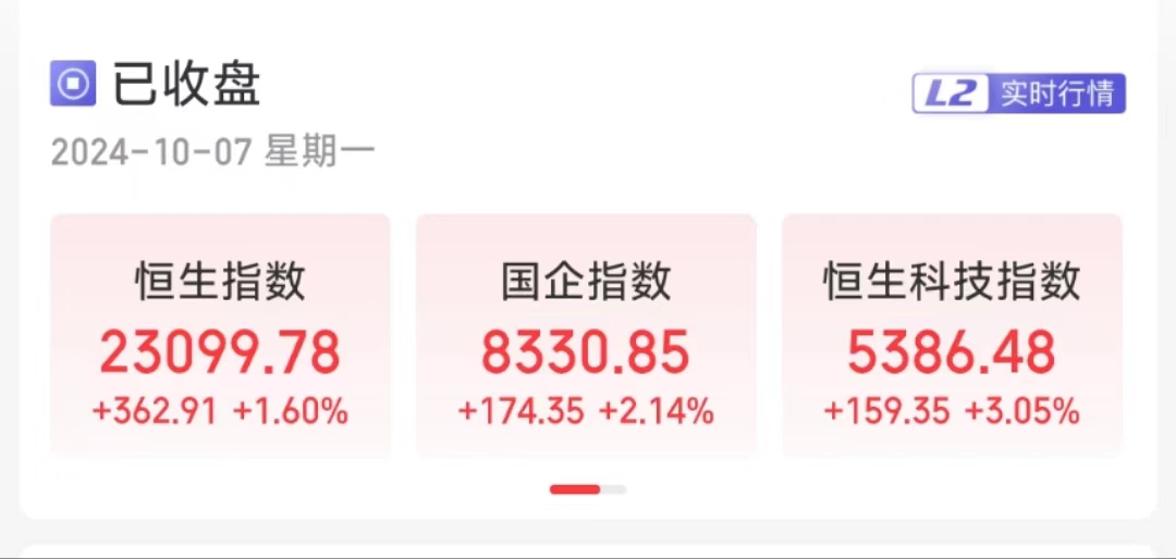 【大河财立方 记者 史冰倩】10月7日,港股三大指数高开。但不久盘中一度转跌,随后逐步拉升。截至收盘,恒生指数涨1.60%报23099.78点,恒生中国企业指数涨2.14%报8330.85点,恒生科技指数涨3.05%报5386.48点。香港恒生指数和恒生科技指数均创2022年2月以来新高。