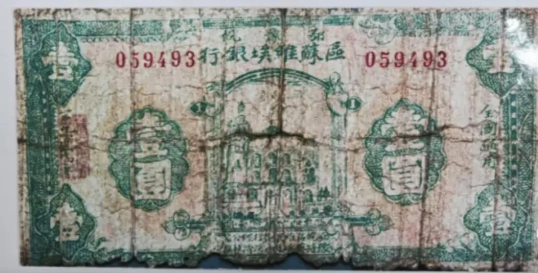 这张保存完好的“鄂豫皖区苏维埃银行”壹元纸币,通体绿色,正面印有发行机构、面值和苏联建筑图案,其上标注“全国通用”;背面写有“全世界无产阶级联合起来”字样。