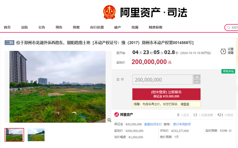 【大河财立方消息】10月10日消息,据阿里司法拍卖平台,郑州市北龙湖一地块二次拍卖,起始价2亿元,土地使用权面积44438.31㎡(约66.66亩),为医卫慈善用地。