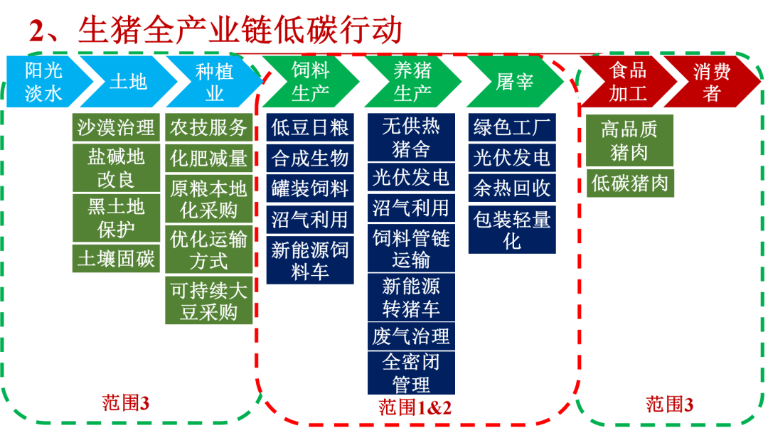 在企业三价值的指引下,牧原连续10年发布了社会责任报告,并在2021年发布了行业首份绿色低碳行动报告,提出了绿色低碳战略目标,并在生猪全产业链积极开展低碳行动,不仅关注饲料、养猪、屠宰三大业务,更要把视野拓展到上游的种植业,以及更前端的淡水、土地、阳光等资源,后端的食品加工、消费者群体等。