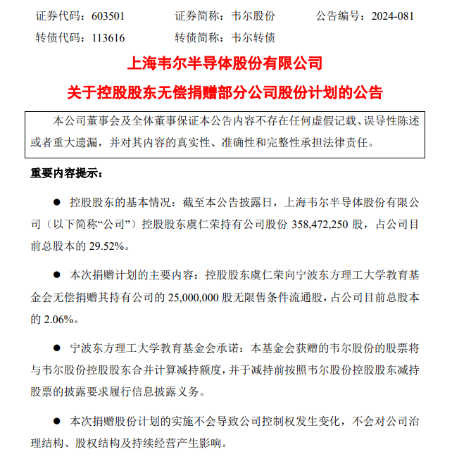 今年3月,韦尔股份曾公告,为支持教育事业发展,并资助宁波东方理工大学教育基金会开展慈善公益活动,韦尔股份控股股东虞仁荣通过其一致行动人绍兴市韦豪股权投资基金合伙企业(以下简称:绍兴韦豪),向宁波东方理工大学教育基金会无偿捐赠其持有的韦尔股份1500万股无限售条件流通股,占公司目前总股本的1.23%。