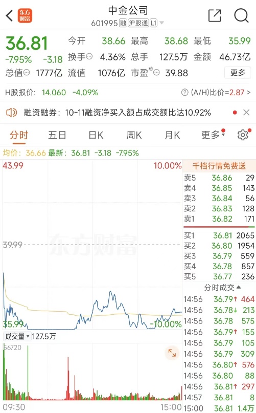 【大河财立方 见习记者 王宇 上海报道】10月14日,中金公司A股盘中一度跌停,报35.99元/股。截至收盘,中金公司跌幅达7.95%,报36.81元/股。