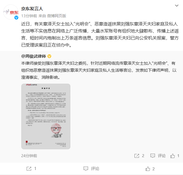 【大河财立方消息】10月16日,京东发言人微博发文称:“近日,有关章泽天女士加入‘光明会’、恶意造谣抹黑刘强东章泽天夫妇家庭及私人生活等不实信息在网络上广泛传播,大量水军账号有组织地大肆散布、传播上述谣言,短时间内炮制出上万条谣言信息。刘强东章泽天夫妇已向公安机关报案,警方已受理该案且正在侦办中。”