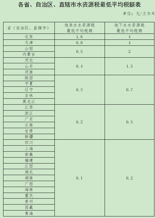 上述负责人表示,水资源税根据水资源状况、取用水类型和经济发展等情况实行差别税额。国家统一明确各省、自治区、直辖市水资源税最低平均税额标准,具体适用税额由各省、自治区、直辖市确定。同时,要求对取用地下水、水资源严重短缺和超载地区取用水从高确定税额。