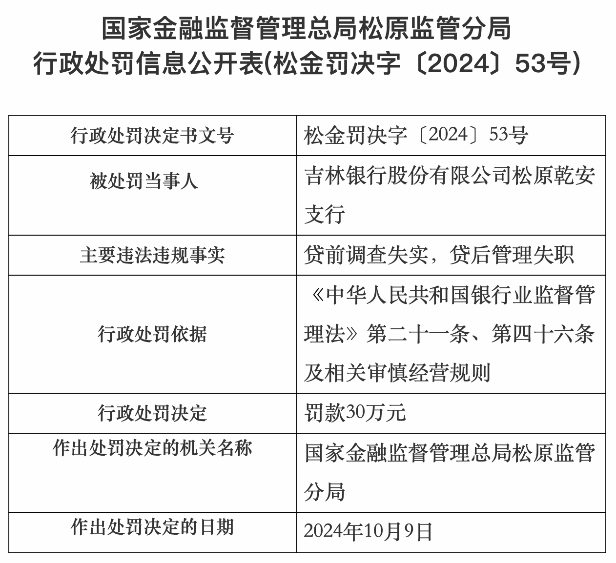 【大河财立方消息】10月17日消息,国家金融监督管理总局吉林监管局行政处罚信息公开表显示,吉林银行股份有限公司松原分行、吉林银行股份有限公司松原乾安支行分别被罚30万元。