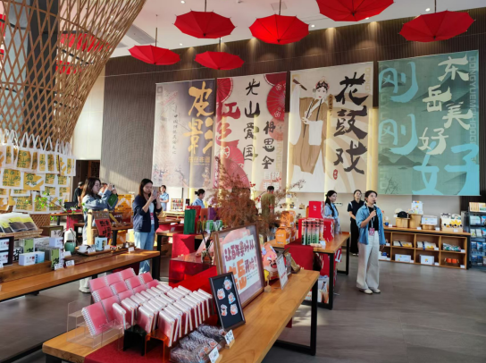 在东岳村余粮乡创运营中心,500多种各类文创产品琳琅满目,来自杭州的专业团队作为“文化产业特派员”入驻该村,投入产品开发、销售等工作。为当地的菱角、手工织物等特产提供平台。