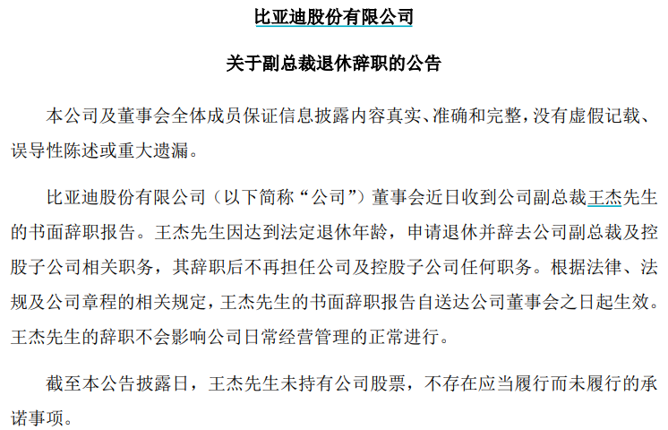 比亚迪公告提到,王杰因达到法定退休年龄,申请退休并辞去公司副总裁及控股子公司相关职务,其辞职后不再担任公司及控股子公司任何职务。根据法律、法规及公司章程的相关规定,王杰的书面辞职报告自送达公司董事会之日起生效。王杰的辞职不会影响公司日常经营管理的正常进行。