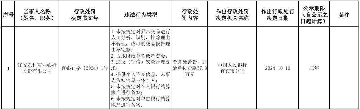 【大河财立方消息】10月19日消息,中国人民银行宜宾市分行近日披露的一份行政处罚决定信息公示表显示,江安农村商业银行股份有限公司因存在多项违法行为,日前被予以警告并处罚款57.8万元。