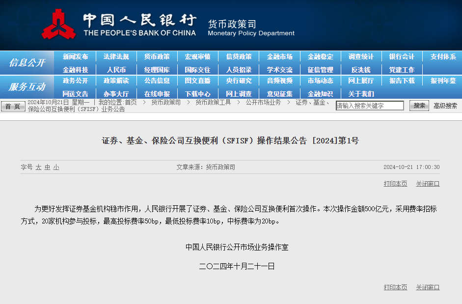 【大河财立方消息】10月21日,央行发布公告,为更好发挥证券基金机构稳市作用,人民银行开展了证券、基金、保险公司互换便利首次操作。本次操作金额500亿元,采用费率招标方式,20家机构参与投标,最高投标费率50bp,最低投标费率10bp,中标费率为20bp。