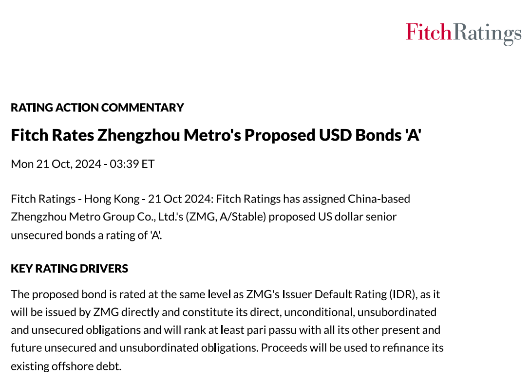 【大河财立方消息】10月21日消息,惠誉评级授予郑州地铁集团有限公司(Zhengzhou Metro Group Co., Ltd.,简称“”郑州地铁,A/稳定)拟发行高级无抵押美元债券‘A’的评级。