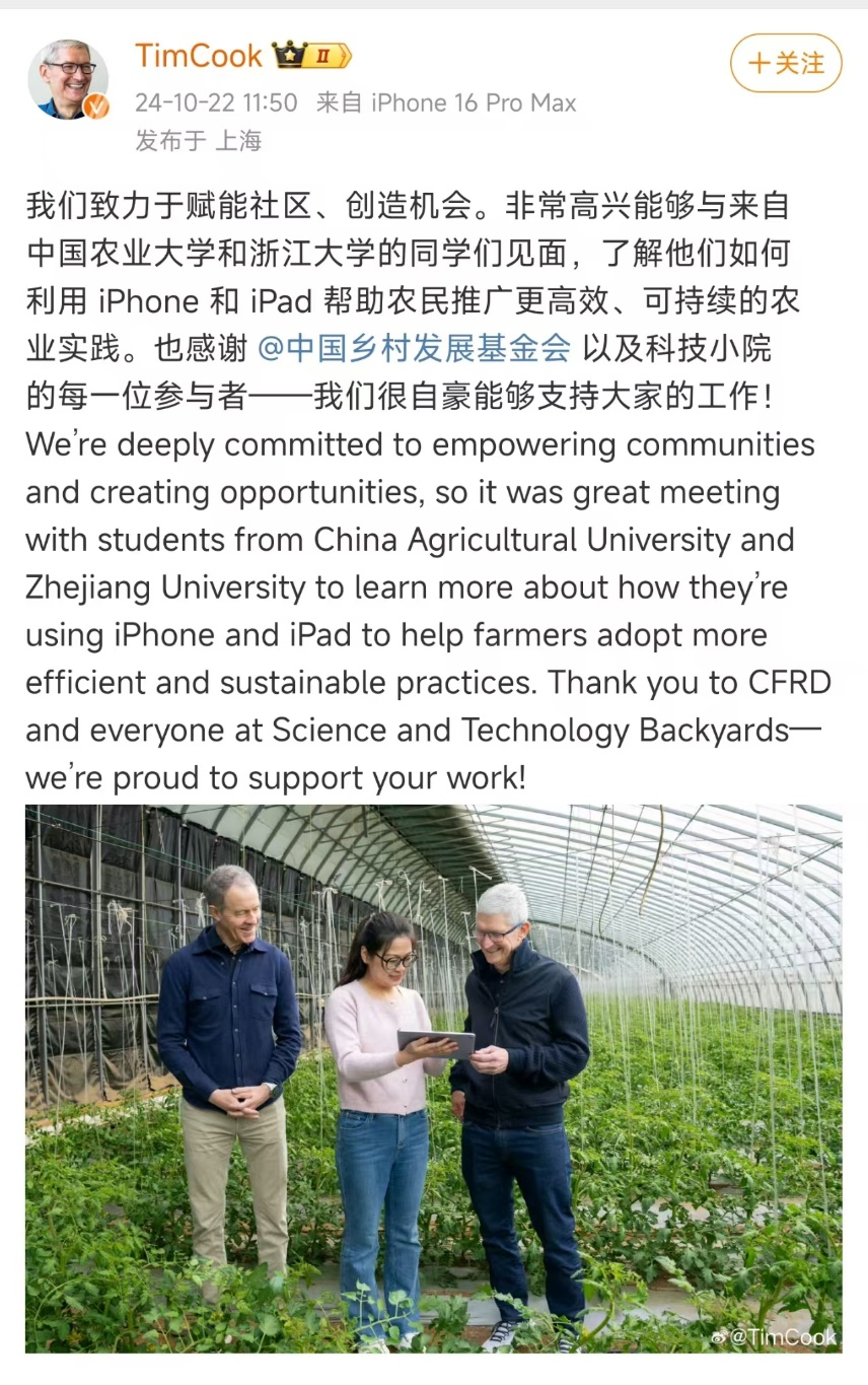 10月22日,苹果CEO库克发布微博表示:“我们致力于赋能社区、创造机会。非常高兴能够与来自中国农业大学和浙江大学的同学们见面,了解他们如何利用iPhone和iPad帮助农民推广更高效、可持续的农业实践。”