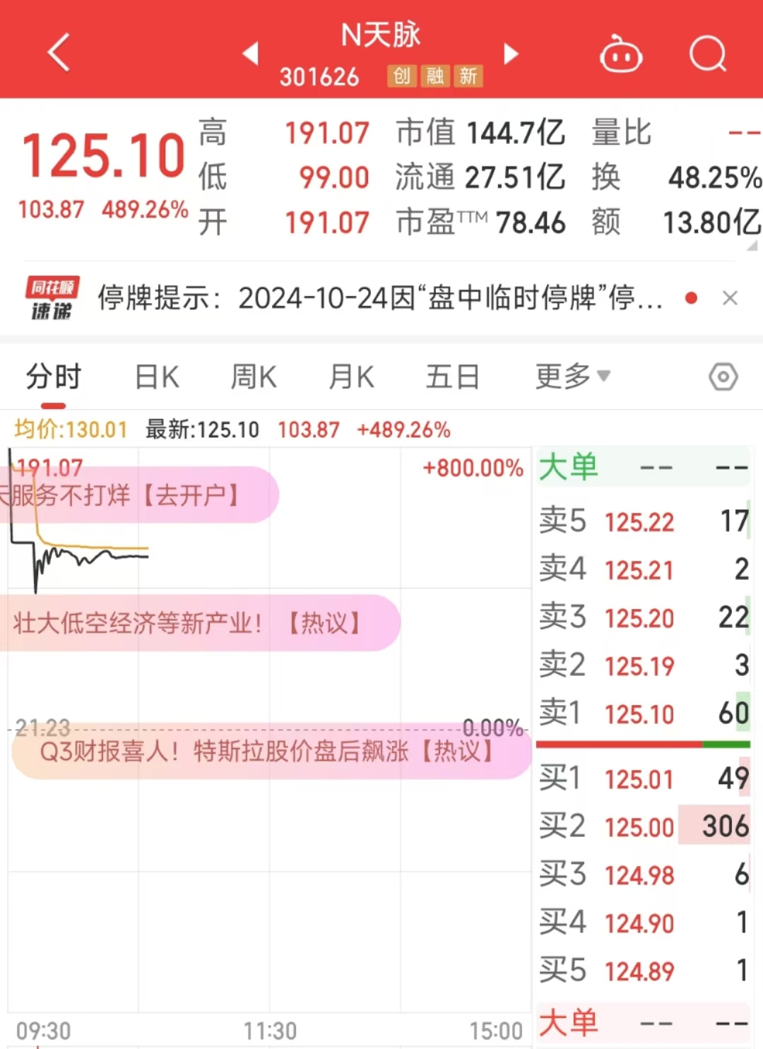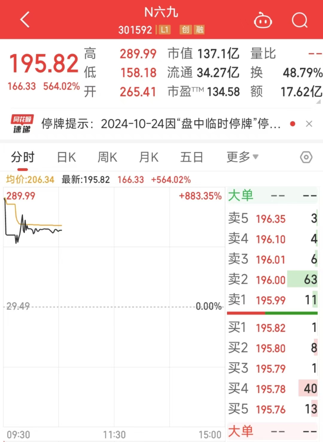 今日,N六九、N天脉均高开800%,N六九盘初最大涨幅触及883%。随后,两只新股大幅回落,双双因“盘中成交价较开盘价首次下跌超过30%”而触发临时停牌。截至10时30分,N六九上涨564%,N天脉上涨489%。