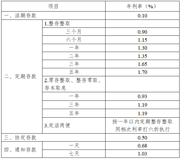 公告显示,活期存款年利率为0.10%,整存整取定期三年存款年利率为1.65%,整存整取定期五年存款年利率为1.70%。
