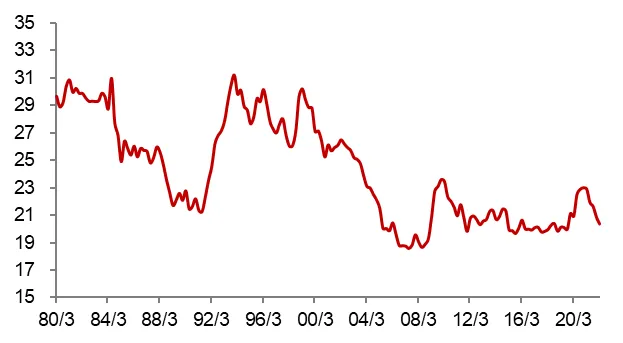 日本经济自90年代房地产泡沫破灭后就开始陷入到长期通缩之中,1991年年末CPI指数为93.1,到2021年才到年末才到100.1,30年CPI累计只上涨了7.5%。尽管在东亚金融危机和美国次贷危机爆发时日本CPI有过短暂的上升,但从泡沫破灭后30年看,始终在零上下徘徊。