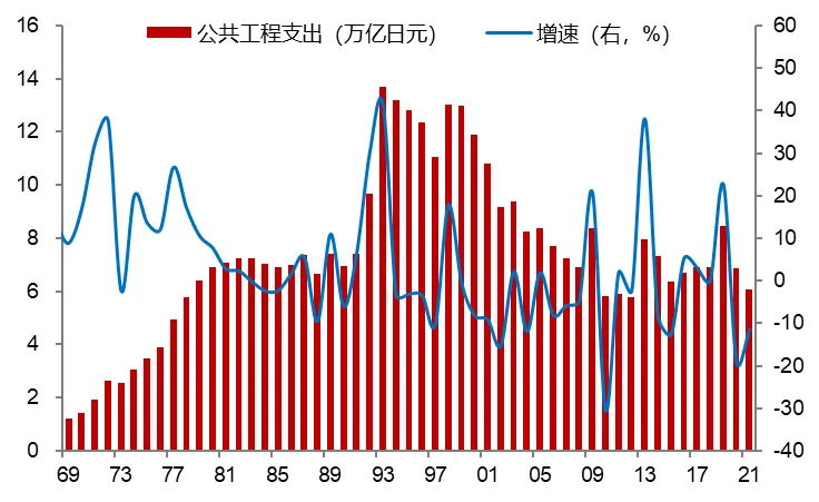为了弥补房地产泡沫破灭带来的投资下降,日本扩大了公共投资规模,如1995年至2007年的基础建设预算就高达650兆日元,超过美国同期3至5倍。如1998年,公共建设的产业工人就占据了总劳动力的10%,达690万人。