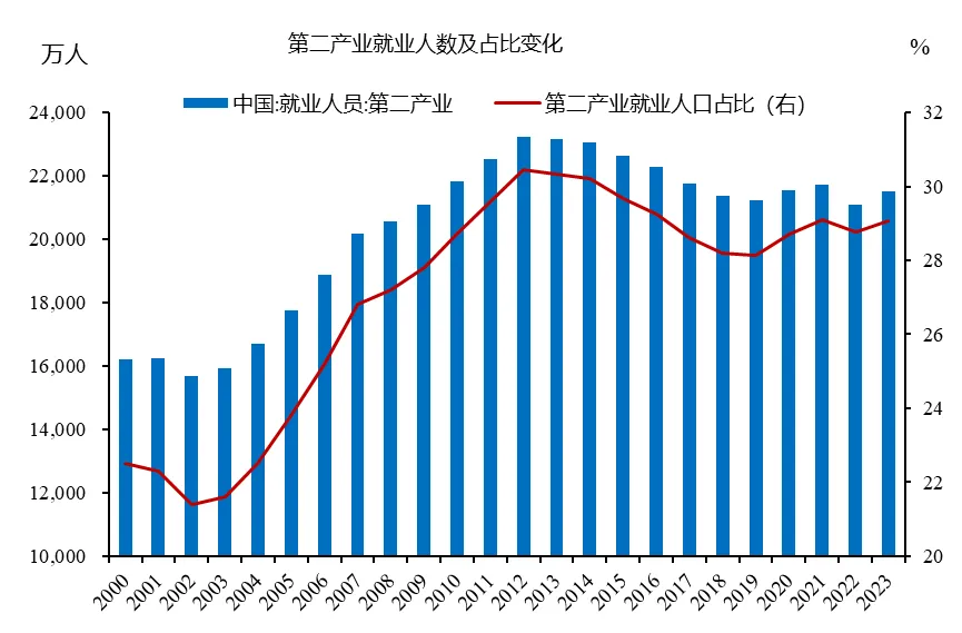 2023年第二产业的就业人数比2012年减少了1706万,从今年1-9月份制造业投资增速高达9.2%这一数据看,未来制造业就业人口数量的减少仍将延续,。而西方国家在步入后工业化时代后,通常就大力发展服务业,因为服务业能吸纳就业的人口更多。美国目前服务的就业人口占总就业人口的84%,德国和日本的占比也达到70%左右。