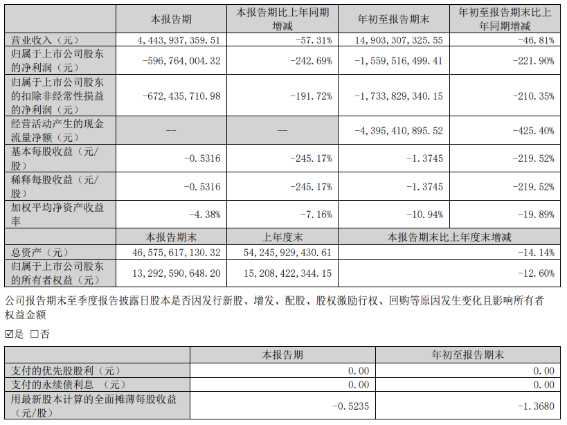 前三季度东方日升实现营业收入149.03亿元,同比下降46.81%;净利润亏损15.59亿元;基本每股收益-1.3745元。第三季度实现营业收入44.44亿元,同比下降57.31%;净利润亏损5.97亿元,同比下降242.69%。