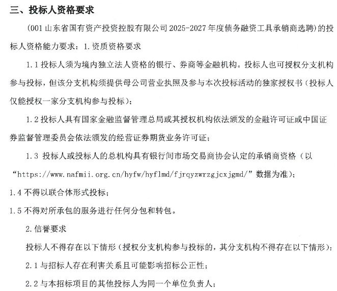 【大河财立方消息】10月29日,山东省国有资产投资控股有限公司(简称山东国投)发布公告,就2025-2027年度债务融资工具承销商选聘。本次招标拟选取不超过25家承销机构作为承销商团。服务期限自取得注册批复之日起两年。