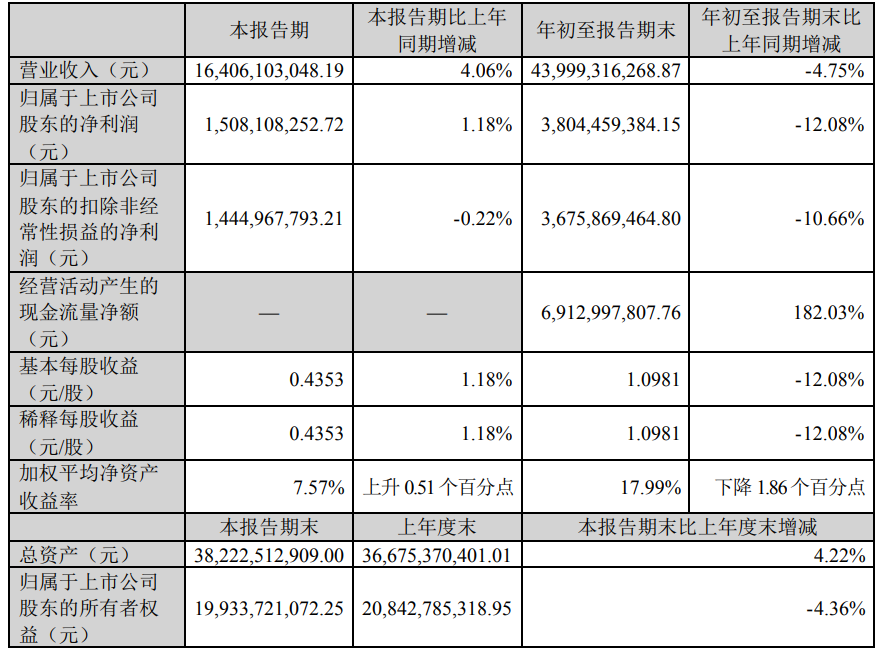 第三季度,双汇发展实现营业收入164亿元,同比增长4.06%;实现归属于上市公司股东的净利润15.08亿元,同比增长1.18%。