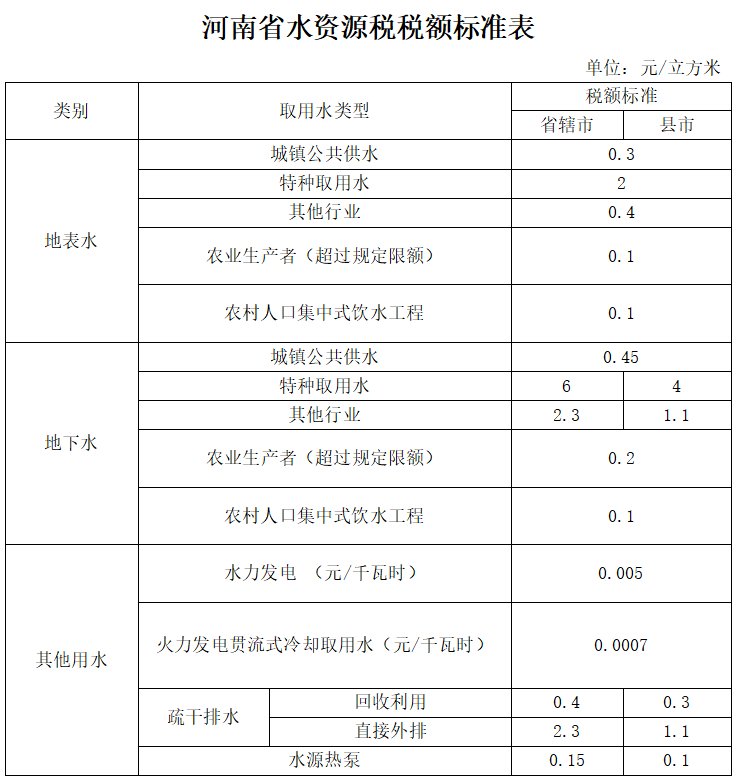 三、河南省水资源税具体适用税额按照《河南省水资源税税额标准表》执行。