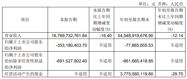 2024年第三季度营业收入167.7亿元,同比下降16.4%;归属于母公司所有者的净利润亏损3.53亿元,上年同期净亏损3.21亿元,连续亏损且亏损扩大。