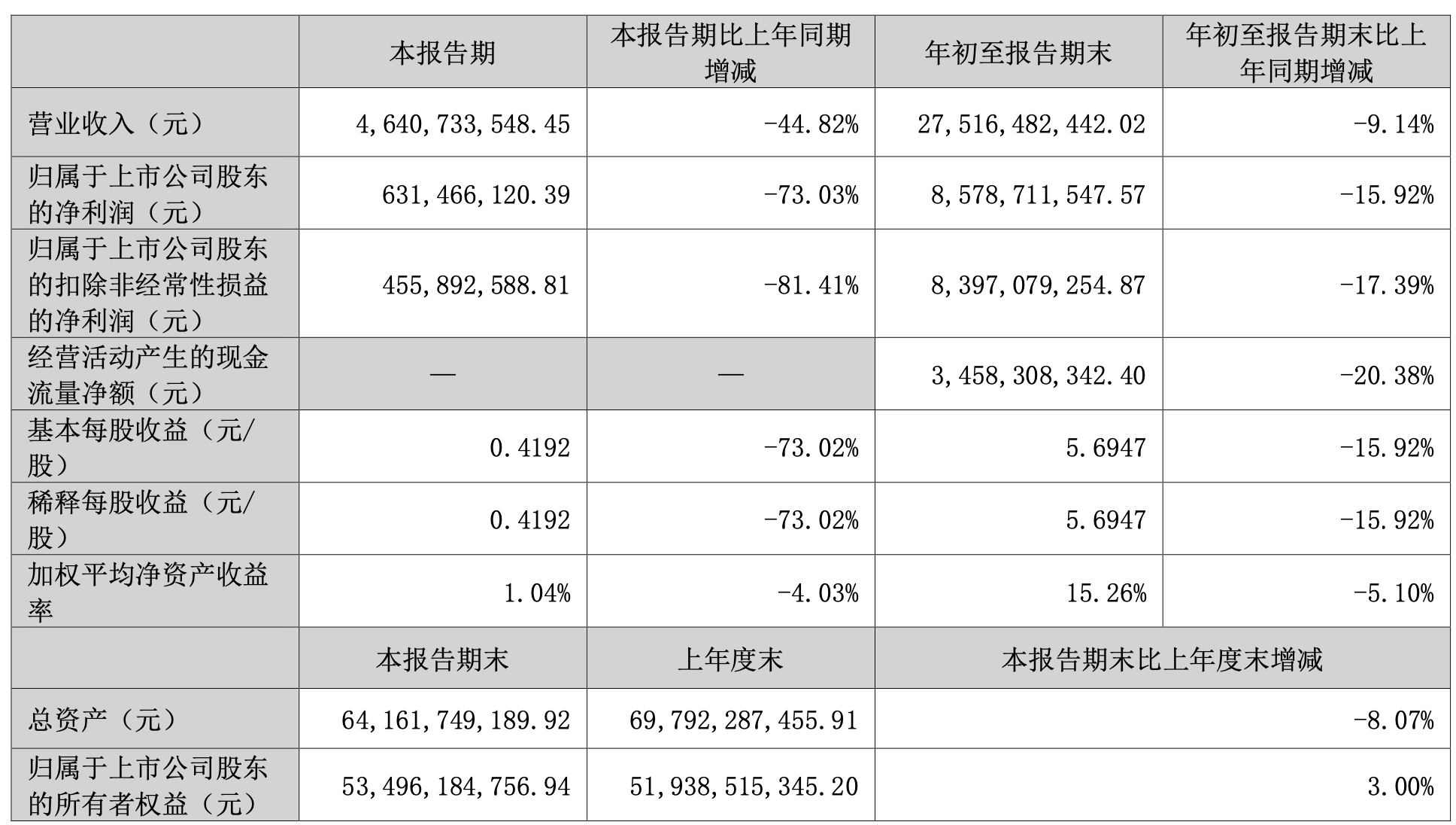 报告显示,前三季度,洋河股份实现营业收入275.16亿元,同比减少9.14%;归母净利润85.79亿元,同比减少15.92%。其中,第三季度洋河股份实现营业收入46.41亿元,同比减少44.82% ;归母净利润6.31亿元,同比减少73.03%。