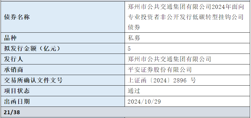【大河财立方消息】10月30日,郑州市公共交通集团有限公司2024年面向专业投资者非公开发行低碳转型挂钩公司债券项目,已获上交所通过。