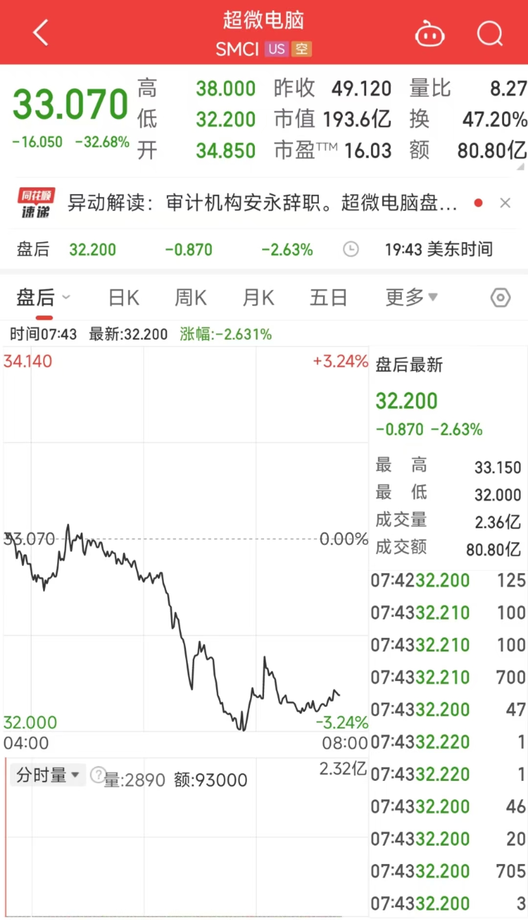 【大河财立方消息】10月31日消息,美股AI巨头超微电脑遭遇“黑天鹅”。当地时间10月30日,超微电脑股价暴跌超30%,收跌32.68%。消息面上,安永会计师事务所辞去了超微电脑的审计职务,理由是对公司治理和透明度表示担忧。