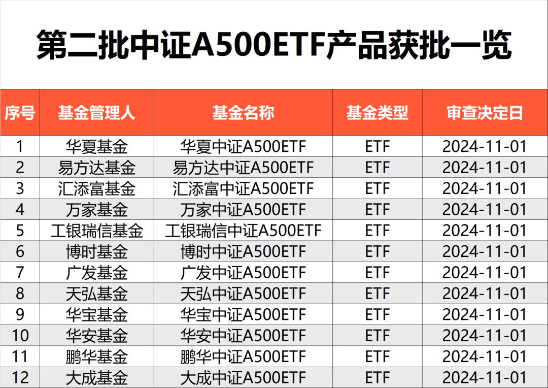 11月1日,记者从多家基金管理人处获悉,易方达、华夏、广发、华安基金等12家基金公司申报的中证A500ETF产品,已经正式获批,纷纷拿到批文。从产品申报、受理到获准发行,仅用了1个交易日。