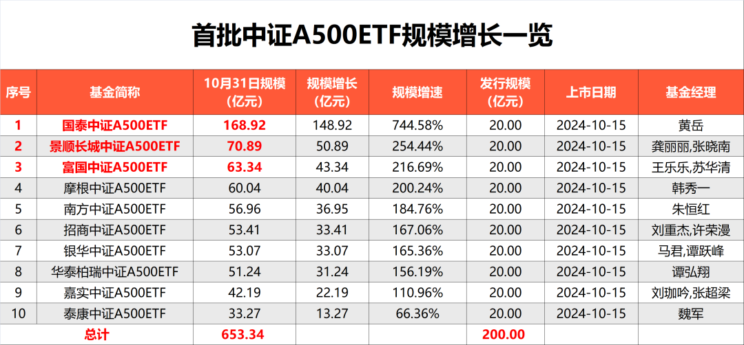 Wind数据显示,截至10月31日,首批10只中证A500ETF的总规模已突破653亿元,是产品发行规模的3.26倍,多数产品出现翻倍式增长。另外,正在发行的20只中证A500场外指数基金,首发募集规模已超过470亿元。