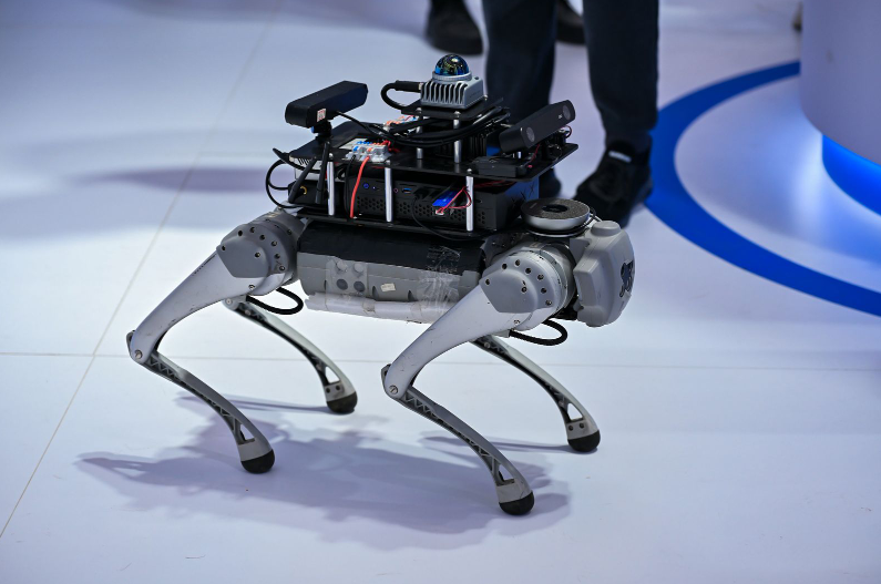 “你好,我是小白……”在人工智能+机器人板块,透过观众围成的人墙,可以看到一个“电子狗”正在绕着展区巡视。据了解,这个“电子狗”形态的机器人叫作小白,是欧亚高科数字技术有限公司(以下简称欧亚高科)研发的四足巡检机器人,主要用于化工园区以及化工企业等危险作业区域的巡检工作。