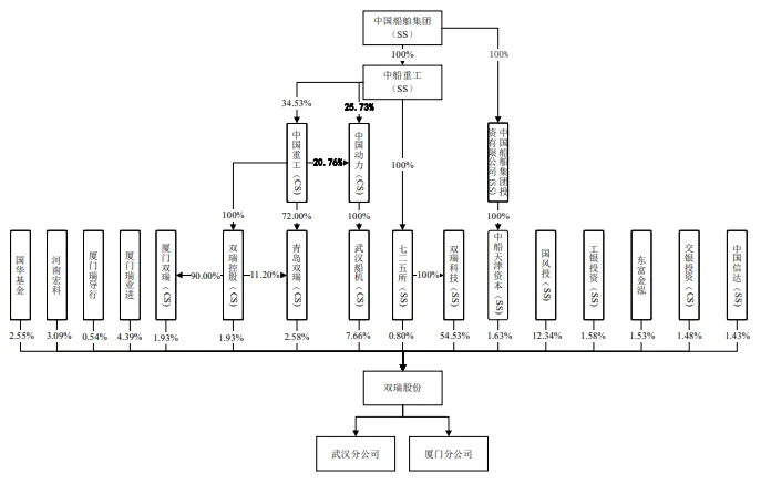 股权方面,中国船舶集团通过双瑞科技、武汉船机、青岛双瑞、厦门双瑞、双瑞控股、中船天津资本、七二五所合计间接持有公司 71.07%股份,为公司的实际控制人。