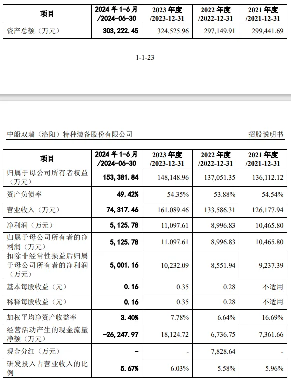 财务方面,2021年—2024年上半年,双瑞股份营业收入分别为12.62亿元、13.36亿元、16.11亿元、7.43亿元;净利润1.05亿元、0.9亿元、1.11亿元、0.51亿元。