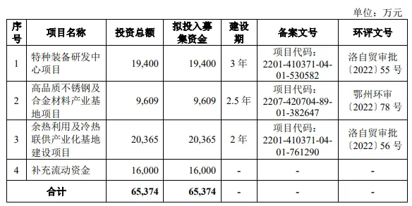 双瑞股份招股书上会稿显示,此次公司募集资金将用于特种装备研发中心项目(1.94亿元)、高品质不锈钢及合金材料产业基地项目(0.96亿元)、余热利用及冷热联供产业化基地建设项目(2.04亿元)和补充流动资金(1.6亿元)。
