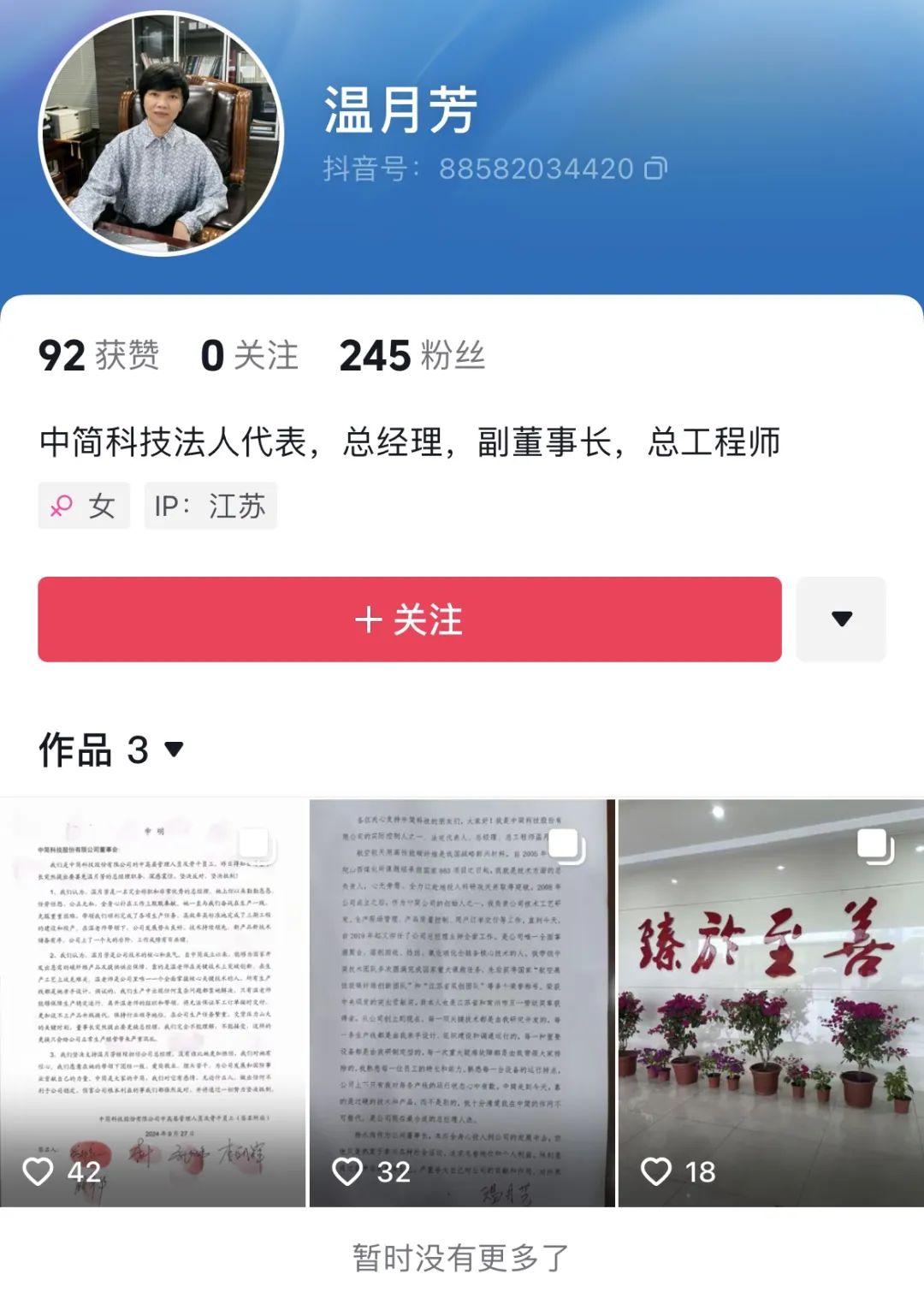 上证报记者注意到,同日,在抖音平台上,一个名为“温月芳”、简介为“中简科技法人代表、总经理、副董事长、总工程师”的账号连续发布多个视频,内容直指“温月芳”与董事长杨永岗之间的矛盾分歧。
