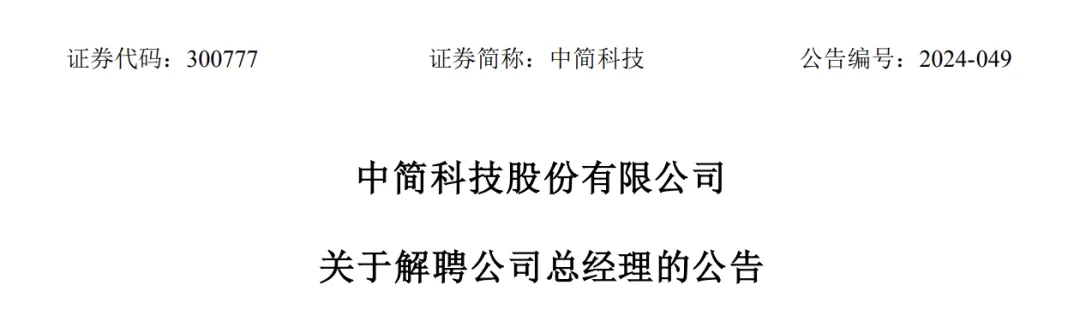 公告显示,中简科技召开了第三届董事会提名委员会第五次(临时紧急)会议、第三届董事会第十七次(临时紧急)会议,审议通过了《关于解聘公司总经理温月芳的议案》。