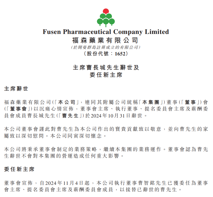 【大河财立方消息】11月4日,河南港股上市公司福森药业公告,公司董事会主席、执行董事、提名委员会主席及薪酬委员会成员曹长城于2024年10月31日辞世。