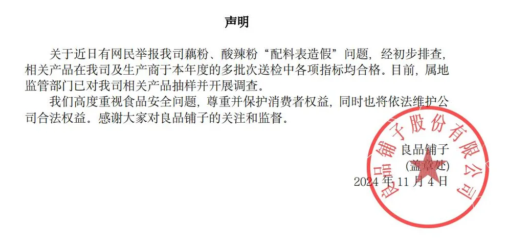 同日,良品铺子发表声明回应:关于近日有网民举报公司藕粉、酸辣粉“配料表造假”问题,经初步排查相关产品在公司及生产商于本年度的多批次送检中各项指标均合格。目前,属地监管部门已对公司相关产品抽样并开展调查,请消费者等候监管方公示调查结果。该公司表示,尊重并保护消费者权益,并将依法维护公司合法权益。