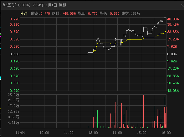 11月4日,和谐汽车股价收涨48.08%。11月5日开盘,其股价一度上涨15.58%,不到两天时间累计涨幅67.92%。