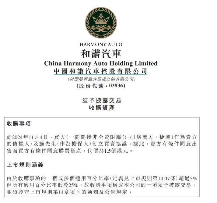 【大河财立方 记者 陈玉尧】11月4日晚间,河南港股上市公司和谐汽车公告,其子公司和谐新能源汽车服务(香港)有限公司与联大汽车有限公司、联大汽车债权人香港捷兴贸易等签订协议,拟以1.5亿港元收购联大汽车相关资产。