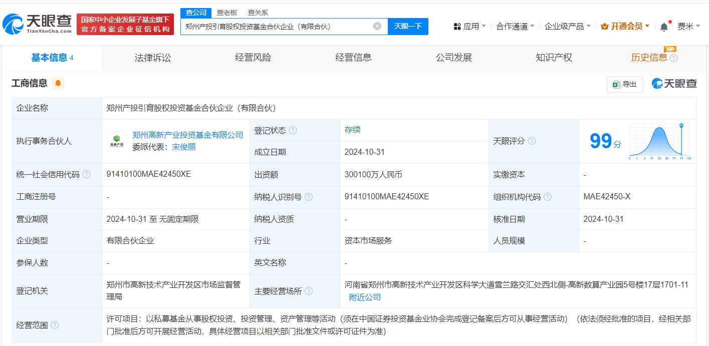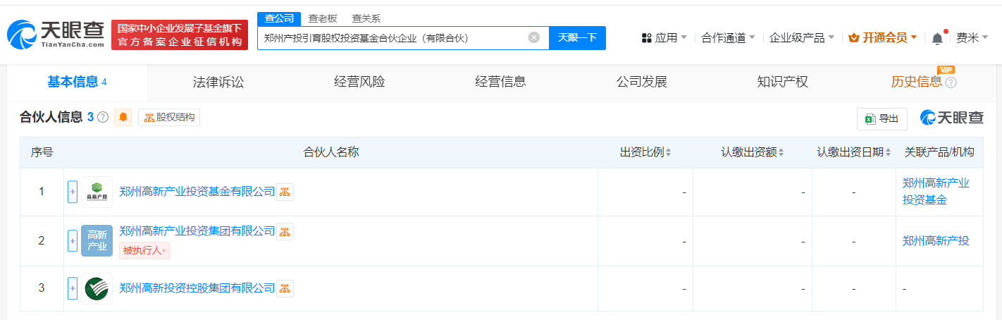 合伙人信息显示,郑州产投引育股权投资基金由郑州高新产业投资基金有限公司、郑州高新投资控股集团有限公司、郑州高新产业投资集团有限公司共同出资,执行事务合伙人为郑州高新产业投资基金有限公司。