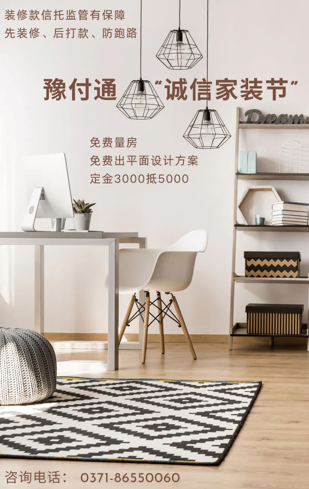为响应政府号召、助力建设“信用河南”,中原信托推出“诚信家装节”活动。获得了众多装修公司支持,如华悉装饰、成品家、圣峰装饰等,在九月举办了进社区、首批项目落地等活动。中原信托作为受托人,对装修预付资金全程进行监管,阶段施工完毕业主确认后支付,资金安全有保障,同时推出了众多优惠活动,报名即可享受定金3000元抵5000元的优惠,还有免费量房、免费出平面设计方案等服务。