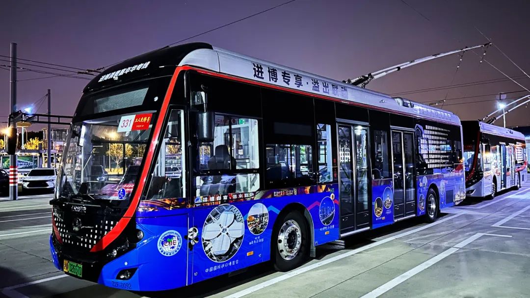 本届进博会宇通服务用车涵盖双源无轨电车、公路新能源C11E等多种车型,包含明星接驳线路71路(83辆双源无轨电车)为参会人员出行提供各项服务保障,宇通通信指挥车、智慧警务工作站等为会议提供安全保障。
